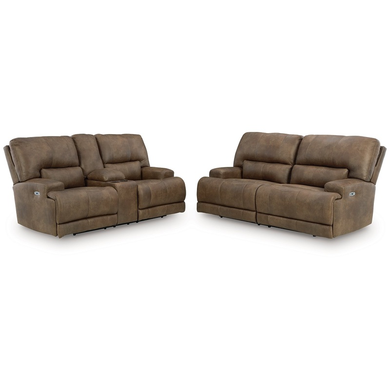Expansive and elegant, this power reclining seating package makes a sizable style statement. Its large scale enhances the luxe look and magnifies the beauty of faux leather in an earth tone, punctuated with jumbo stitching. One-touch power adjustable headr