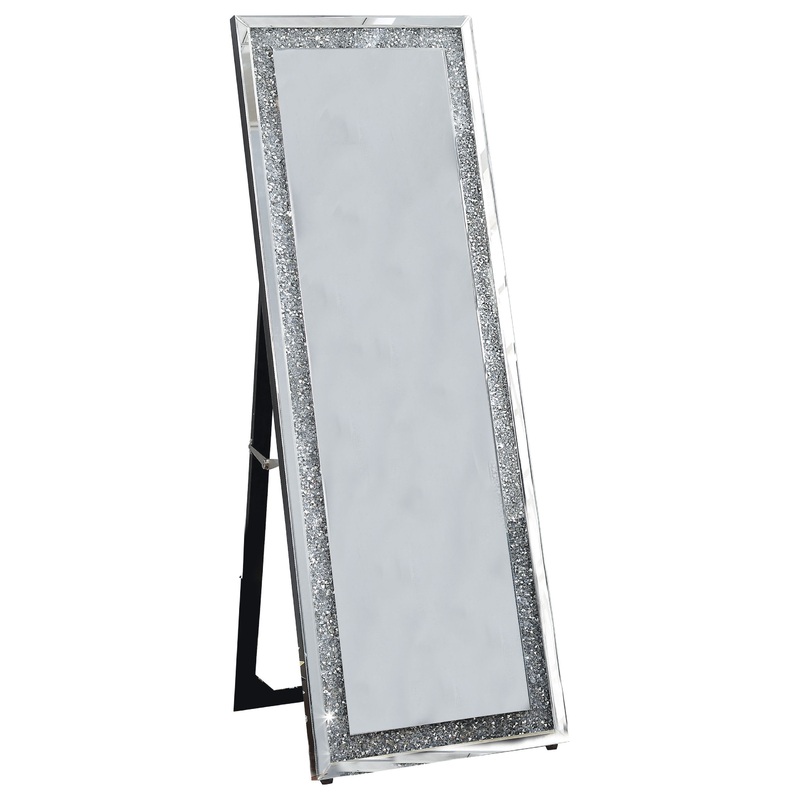 This Floor Mirror provides your new bedroom with a full length reflective accent that perfectly matches your glam sense of style. Showcasing a rectangular silhouette, this floor mirror is constructed from Composite Wood with a fold out back leg support. Its polished mirrored panels border the edges of the frame with a secondary inner border that is made from tiny, glittering clear glass faux crystals for a striking effect. Add this mirror to your home and check your look before you head out the door.