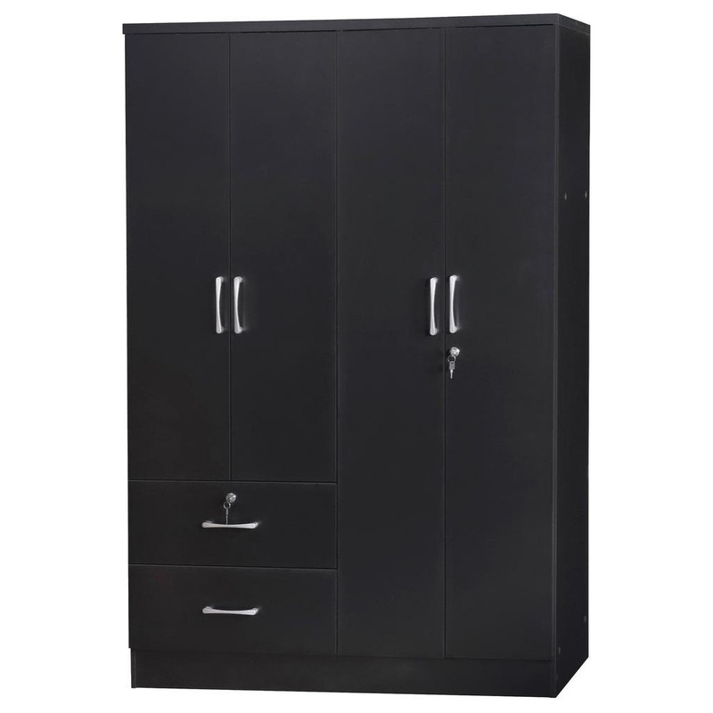 -Constructed of premium laminated engineered wood in Black color finish.Large cabinet with two lockable doors features a clothing rod and a fixed shelf on top. Small two door cabinet is equipped with 2 removable shelves and a clothing rod.
