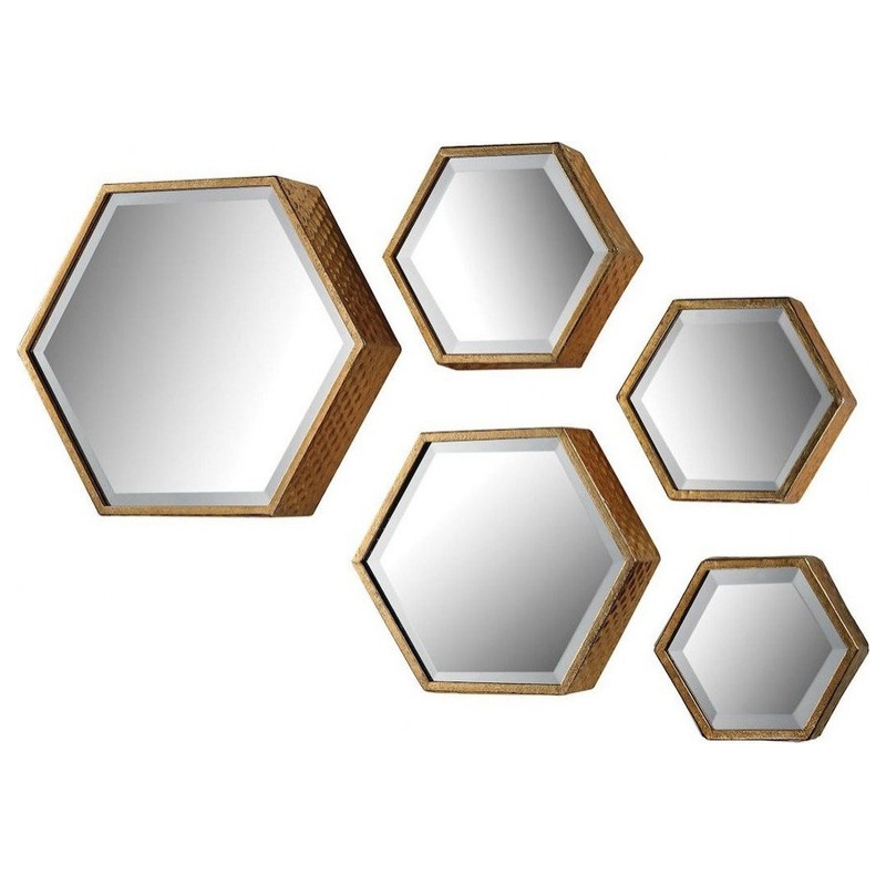 Beveled Hexagon Wall Decor Mirror Set in Honeycomb Embossed Gold Metal Frame 16 inches W x 14 inches H . Mirrors Set of 5. Set of five hexagonal wall mirrors in a honeycomb embossed gold metal frame.Features: Product Type: Wall Decor MirrorMaterial: Metal
