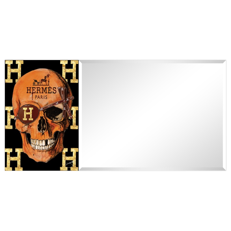 Empire Art Directs collection of printed, frame-less, free floating, tempered glass was inspired by the French technique of Verre Eglomise in which artist’s literally painted the back of clear glass so that when viewed from the front the painting is brought to life under the depth of the glass. This piece of a designer skull takes that same tempered glass and displays a beveled mirror in front of it. 2 strong steel hangers are attached to the back of the mirror for a quick and easy horizontal installation.