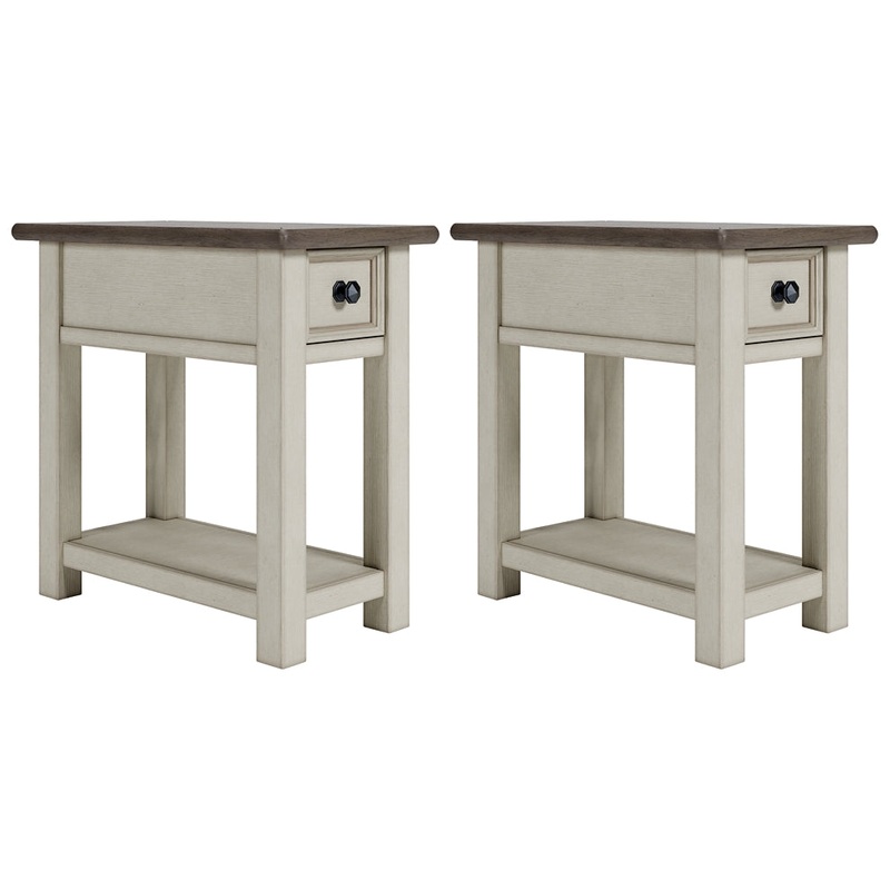 Whether your style is farmhouse fresh, shabby chic or country cottage, youll find this chairside end table set dressed to impress. Its two-tone finish pairs weathered oak with antique white for that much more quaint character. Charming elements include a plank-and-frame style top, black faceted hardware and a smooth-gliding drawer for remote controls and more. Integrated power supply with USB charging is ideal for keeping your personal devices at the ready.