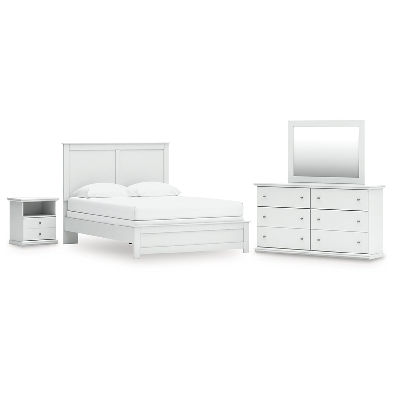 Details B139B43: Includes panel headboard/footboard and rails, Made with engineered wood (MDF/particleboard/plywood) and decorative laminate for the right balance of affordability and durability, Replicated solid white paint, Decorative laminate replicates natural or man-made material surfaces with consistent color, pattern and texture, Foundation/box spring required, sold separately, Mattress available, sold separately, Assembly required, B139B40: Includes dresser and mirror, Made of engineered wood (MDF/particleboard), Knobs with pewter-tone finish, Scalloped moulding, 6 smooth-operating drawers, Includes tipover restraint device, Mirror attaches to back of dresser; can also be mounted on wall horizontally or vertically, Safety is a top priority, clothing storage units are designed to meet the most current standard for stability, ASTM F 2057 (ASTM International), Drawers extend out to accommodate maximum access to drawer interior while maintaining safety, B139-91: Made of engineered wood (MDF/particleboard), Pewter-tone knobs, 1 smooth-operating drawer, 1 storage cubby, Scalloped moulding, Small Space Solution,