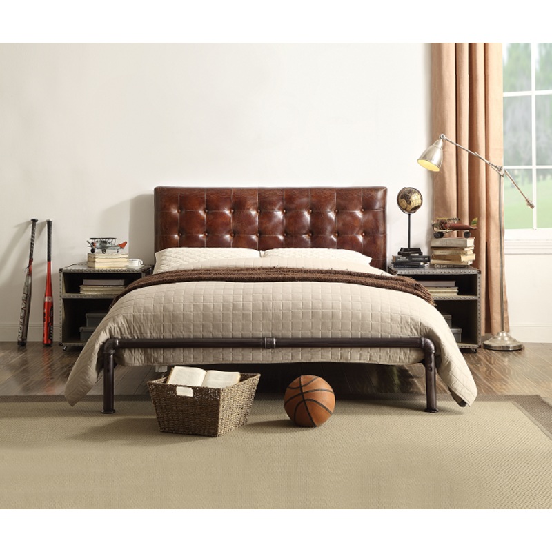 ACME Brancaster Queen Bed, Vintage Brown Top Grain Leather (1Set/3Ctn), 89" x 63" x 42"H, 166lbs. The Brancaster queen bed combines a vintage look with a classical design. This bed features a top grain leather upholstered button tufted head board and sturd