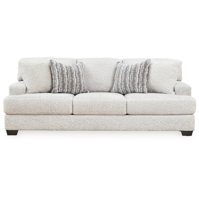 This sofa speaks to those drawn to fresh, contemporary style with richly neutral appeal. Wrapped in a wonderfully plush fabric loaded with multi-tonal interest, this on-trend piece has a warm, welcoming charm. Coordinating accent pillows add to the indulgence. Kick back, relax and settle in for comfort with this cool addition for modern spaces.