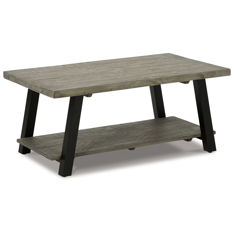 This rectangular coffee table is an achievement in urban contemporary styling. Its ultra-cool design pairs a thick slab-style tabletop and an open lower shelf of solid pine wood with linear metal legs. A weathered gray finish keeps the aesthetic warm and i