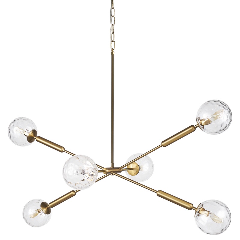 The Britton Chandelier is a 6-light fixture made of an electroplated gold finished metal and clear water glass textured glass globes.