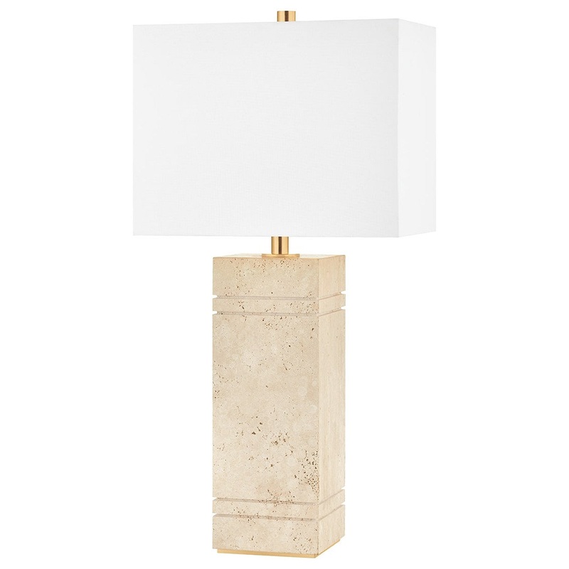 Brownsville is modern design that's made to move. The precision cut and beautiful lines of the natural travertine base make this posh and portable table lamp stand out. Soft light filters through the Belgian linen shade and the aged brass finial adds just