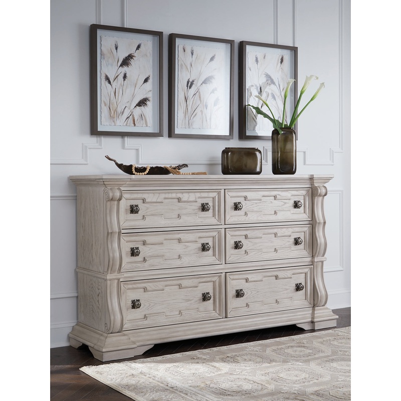 Inspired by the grandeur and grace of European traditional style, this opulent dresser is nothing short of stunning. Its large-scale decorative scrolled pilasters, along with an ash swirl border and walnut inlay crowning the top, are sure to make a sophisticated statement in your restful retreat. A timeless antiqued white coloration and bronze-tone drawer pulls lend an air of subtle elegance to this sumptuous piece.