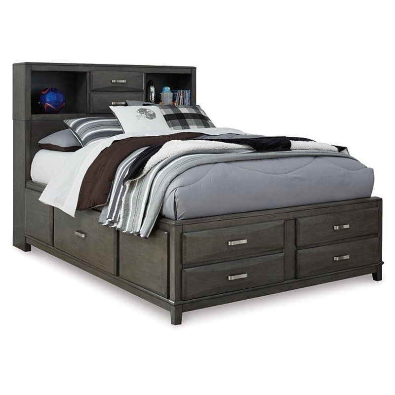 Contemporary style is shaping up beautifully. Designer elements are evident from every angle in this full storage bed. Quality crafted with dovetail construction, contoured drawers solve small space problems with ease. On one side of the bed a deep drawer provides storage for everything from extra bedding and pillows, to seasonal clothes and more. Additional storage at the top and foot of the bed has you covered from head to toe.