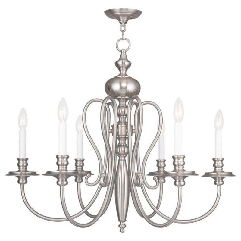 Refreshing and fashionable, decorate your ceiling with the Caldwell collection. Sweeping arms offer classic sophistication for your interior design. Brushed nickel finish complements it's elegant form. -Finish: Brushed Nickel -Number of Bulbs: 6 -Bulb Base