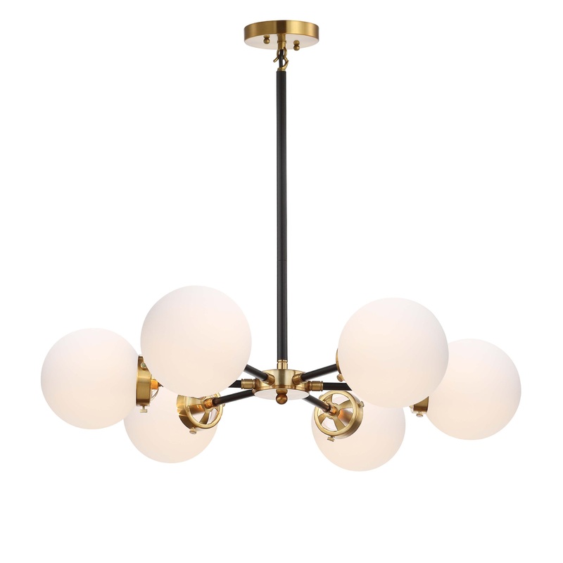 Featuring a brass gold and flat black finish, this six-light chandelier is both neutral and decorative. With frosted glass spheres, this chandelier is decorated carefully to evoke elegant detail. The spoke layout of the arms would be particularly well suit