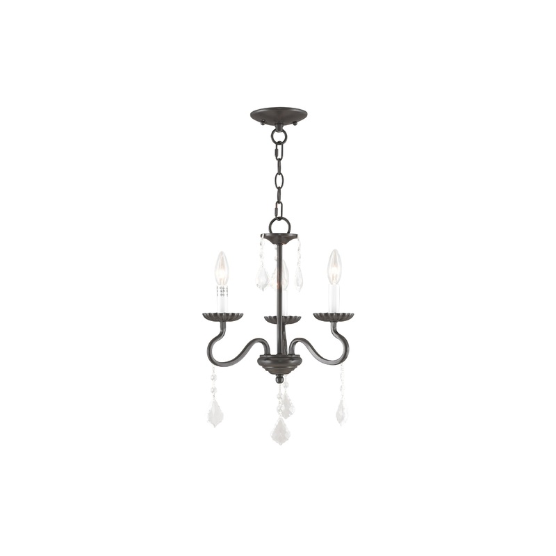 Clear crystals accent the delicate scrollwork of this decorative frame on this three light English bronze mini chandelier that make a traditional interior come together. -Finish: English Bronze -Material: Steel -Number of Bulbs: 3 -Bulb Base Type: Candelab