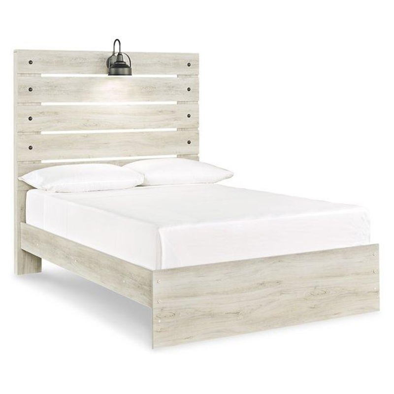 What a delightful take on rustic industrial style. Whether modern loft or modern farmhouse, this full panel bed makes itself at home. The wispy whitewash palette enhances without covering the grain for that weathered look you crave. Love to read in bed? Youre sure to find the retro-chic light sconce and USB plug-ins on the open-slat style headboard such a bright idea.
