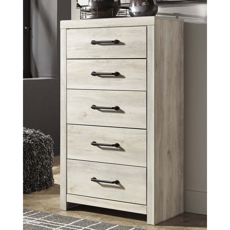 | Details | Made of engineered wood (MDF/particleboard) and decorative laminate, Wispy white finish over replicated oak grain with authentic touch, Large-scale hardware with dark finish, 5 smooth-gliding drawers, Drawer interiors are lined with a faux linen laminate for a clean, finished look, Safety is a top priority, clothing storage units are designed to meet the most current standard for stability, ASTM F 2057 (ASTM International), Drawers extend out to accommodate maximum access to drawer interior while maintaining safety |