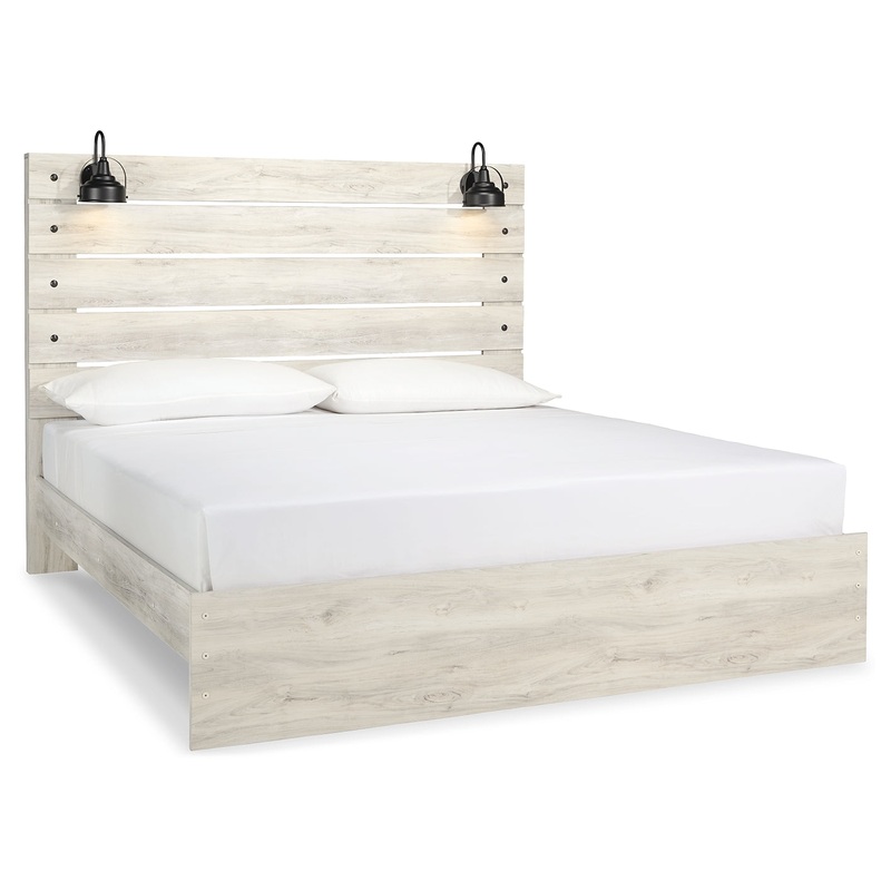 What a delightful take on rustic industrial style. Whether modern loft or modern farmhouse, this king panel bed makes itself at home. The wispy whitewash palette enhances without covering the grain for that weathered look you crave. Love to read in bed? Youre sure to find the retro-chic light sconces and USB plug-ins on the open-slat style headboard such a bright idea.