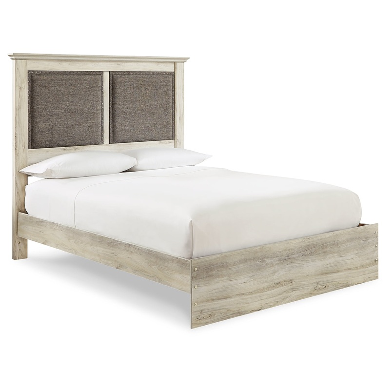 What a delightful take on rustic industrial style. Whether modern loft or modern farmhouse, this upholstered panel bed makes itself at home. The wispy whitewash palette enhances without covering the grain for that weathered look you crave. Smoothly padded upholstered panels punctuated by metal nailhead trim add to the elegance. Discreetly placed USB ports located on the side of the headboard keep your electronics charged up and close at hand.