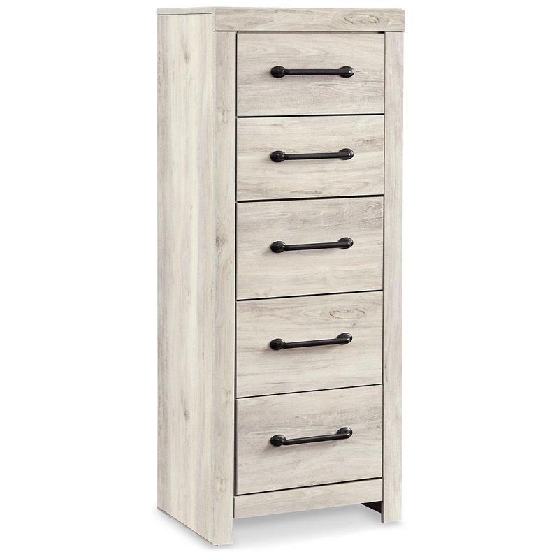 What a delightful take on rustic industrial style. Whether modern loft or modern farmhouse, this narrow chest makes itself at home. The wispy whitewash palette enhances without covering the grain for that weathered look you crave. Designed to accommodate smaller spaces, its linear profile and modern handles are a refreshing change of pace.
