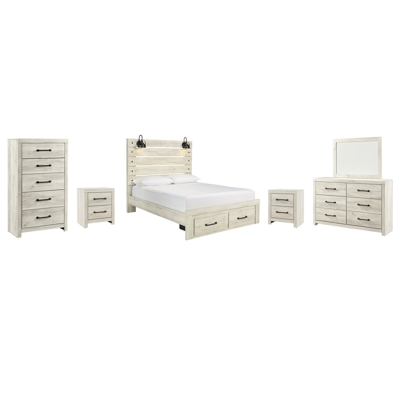 Whether you lean towards modern loft or modern farmhouse, this panel storage bed, two nightstands, chest of drawers and dresser with mirror tip the balance in your favor. The wispy whitewash finish enhances the style without covering the grain for that weathered look you just cant get enough of. Love to read in bed? Youre sure to find the retro-chic light sconces and USB plug-ins on the open-slat style headboard to be a totally bright idea, while the elongated metal drawer pulls really elevate the aesthetic. What a delightful take on rustic industrial style.