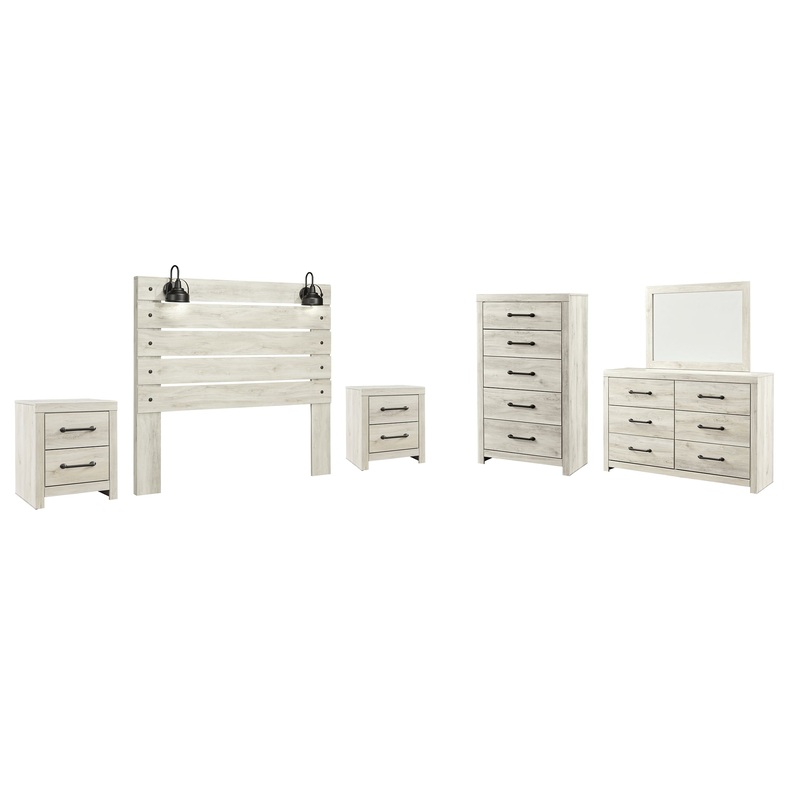 Whether you lean towards modern loft or modern farmhouse, this panel headboard, two nightstands, chest of drawers and dresser with mirror tip the balance in your favor. The wispy whitewash finish enhances the style without covering the grain for that weathered look you just cant get enough of. Love to read in bed? Youre sure to find the retro-chic light sconces and USB plug-ins on the open-slat style headboard to be a totally bright idea, while the elongated metal drawer pulls on the nightstands, dresser and chest of drawers really elevate the aesthetic. What a delightful take on rustic industrial style.