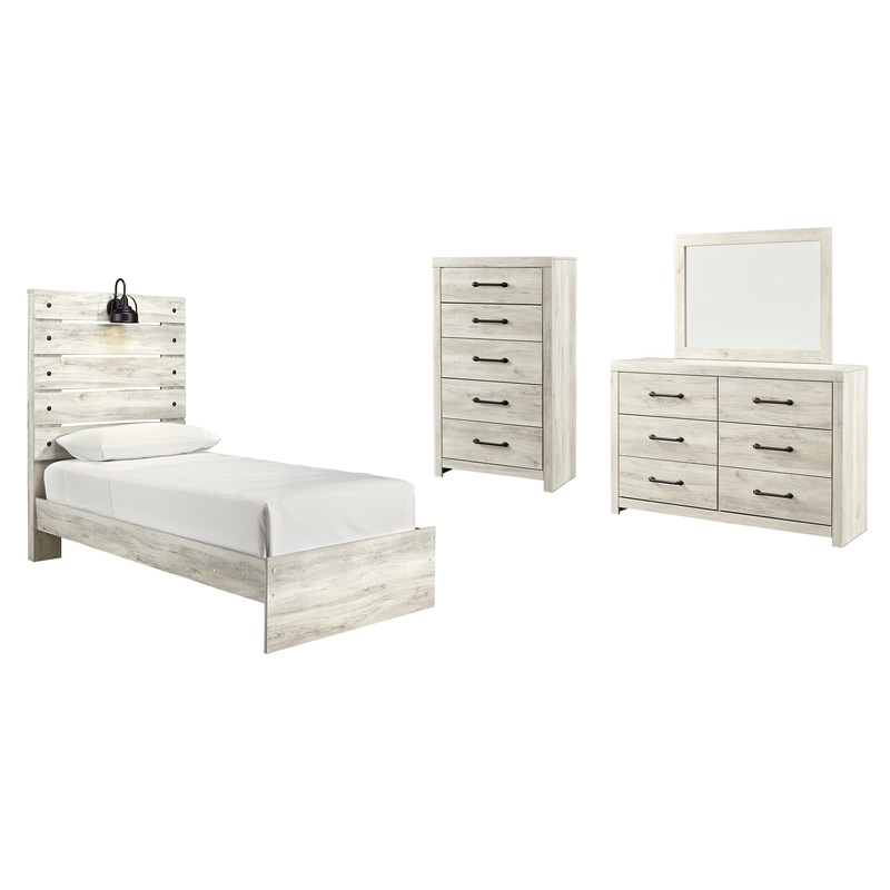 Details B192-46: Made of engineered wood (MDF/particleboard) and decorative laminate, Wispy white finish over replicated oak grain with authentic touch, Large-scale hardware with dark finish, 5 smooth-gliding drawers, Drawer interiors are lined with a faux linen laminate for a clean, finished look, Safety is a top priority, clothing storage units are designed to meet the most current standard for stability, ASTM F 2057 (ASTM International), Drawers extend out to accommodate maximum access to drawer interior while maintaining safety, B192B1: Includes dresser with mirror, Made of engineered wood (MDF/particleboard) and decorative laminate, Wispy white finish over replicated oak grain with authentic touch, 6 smooth-gliding drawers, Drawer interiors are lined with a faux linen laminate for a clean, finished look, Large-scale hardware with dark finish, Mirror attaches to back of dresser, Assembly required, B192B2: Includes headboard, footboard and rails, Made of engineered wood (MDF/particleboard) and decorative laminate, Wispy white finish over replicated oak grain with authentic touch, Decorative sconce light, LED with 3 AA batteries, 2 slim-profile USB charging ports, Power cord included; UL-listed, Foundation/box spring required, sold separately, Mattress available, sold separately, Assembly required, Bed is compatible with an adjustable base,