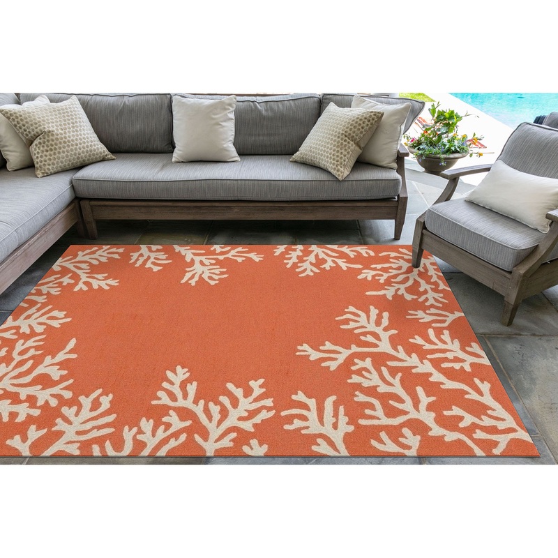 This hand-hooked area rug features a vibrant coral orange background with a white coral motif border. A classic, subtle tropical motif, this rug will effortlessly compliment any space inside or outside your home. Made in China from a polyester acrylic blend, the Capri Collection is hand tufted to create bright multi-toned detailed designs with a high-quality finish. The material is flatwoven, weather resistant and treated for added fade resistant making this the perfect rug for indoor or outdoor placement. This soft, durable piece is ideal for your patio, sunroom and those high traffic areas such as your entryway, kitchen, dining room and living room. A fresh take on nautical style, these area rugs range in style from coastal to tropical motifs that beautifully accent your home decor. Limiting exposure to rain, moisture and direct sun will prolong rug life.