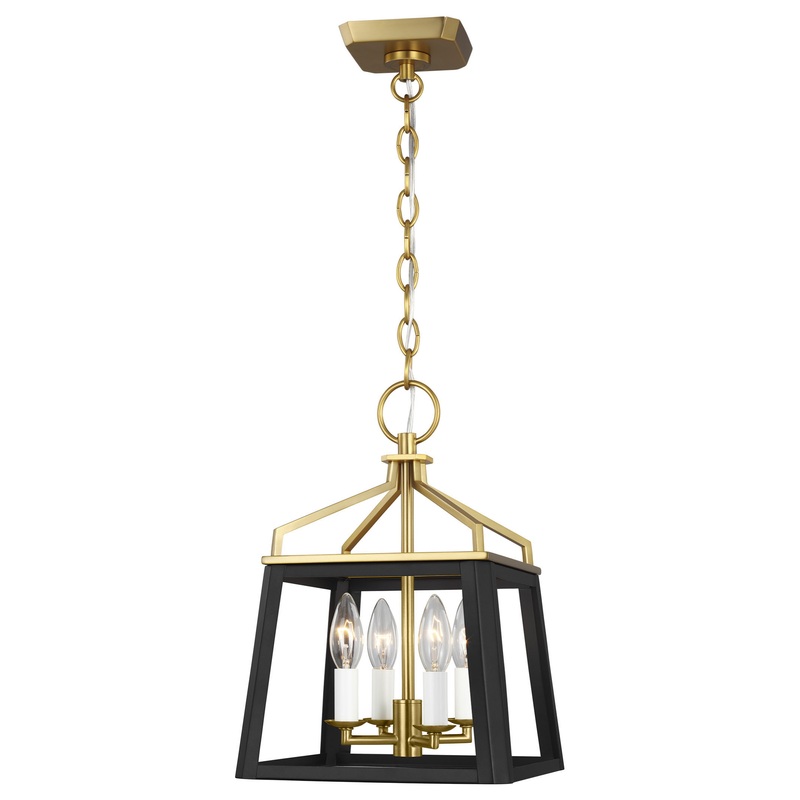 The Carlow four light single tier chandelier in midnight black is a traditional tapered square lantern which is wider at the base and smaller at the top. The body of the lantern has either a black or white metal frame suspended from, and accentuated by, a brass square tube armature. The brass armature is the focal point of the design, and almost looks like a crown on top of the lantern frame.
