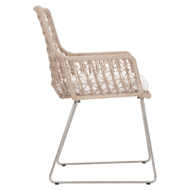 Arm chair frame of tubular Stainless steel.Frame wrapped in twisted Endura fiber in Hazelnut finish.Stainless Steel outdoor glides attach to and wrap the stretchers.Striking design comes from an open weave crafted of twisted abaca all-weather wicker on the