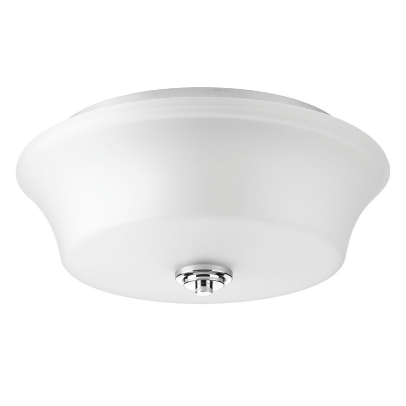 Two-light flush mount with smooth forms and etched glass that produce a beautiful, modern gas light effect. Collection: Cascadia Lighting Specifications: -Wattage: 100 W -Number of Bulbs Required: 2 -Bulbs Included: No -Lamp Type: Incandescent -Socket Base