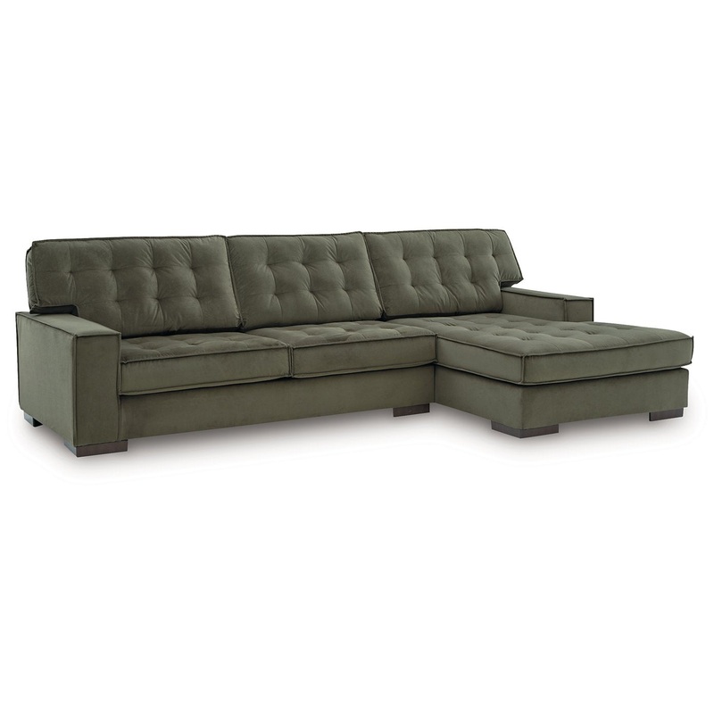 This sleek sectional with chaise offers a highly contemporary look with plenty of space to spread out. Dramatic tufted detailing and luxurious upholstery in a rich olive color create a sophisticated atmosphere. This sectional is perfect for those who love to entertain, or simply relax, in uptown style and comfort.