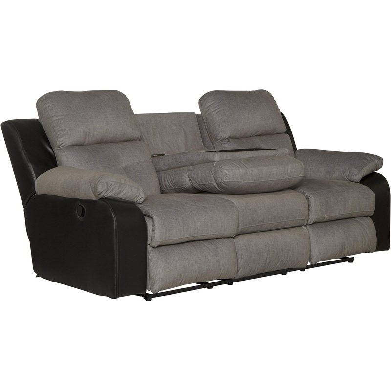This Felix reclining sofa features a drop-down table with two cupholders, pillow arms, and a two-tone color.