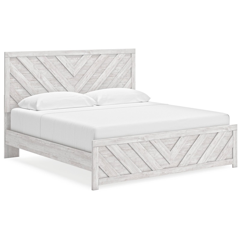 Charmingly designed, this king panel bed embraces the aesthetics of countryside living and repurposes them for modern settings. Its whitewash paint, replicating the wear and tear of time, appeals to your love of vintage character. And a chic chevron pattern on the headboard and footboard keeps your bedroom effortlessly on trend.