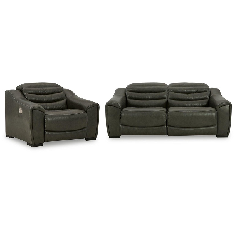 For those seeking to curate a living room retreat that offers superior comfort and a contemporary aesthetic, the sleekly designed Center Line power reclining seating package will become your favorite source of at-home serenity. Rest on combination leather/faux leather upholstery, and use the one-touch power controls to recline and adjust the headrests with ease. As you recharge after a long day, your devices can too with USB charging. This set is visually enticing in a luxe dark gray, with slope track arms and stitched detailing on the back to enhance its modern appeal.
