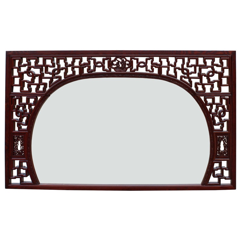 Chinese Reddish Brown Geometric Scenery Carving Wood Frame Wall Mirror – Asian – Wall Mirrors – by Golden Lotus Antiques
