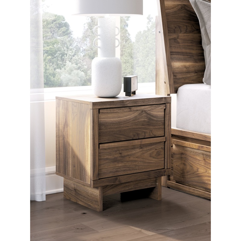 Nostalgic style, retooled for todays trends. This nightstand puts an elevated twist on mod aesthetics. Its warm brown tones reflect the mid-century vibes you love, while the angular base incorporates contemporary motifs. Whether you’re scrolling before bed or setting morning alarms, seamlessly incorporated USB and wireless charging keep devices close. Integrated drawer handles round out the look in sleek style. With this nightstand, you can build your bedroom into a modern haven with a touch of retro-cool flair.