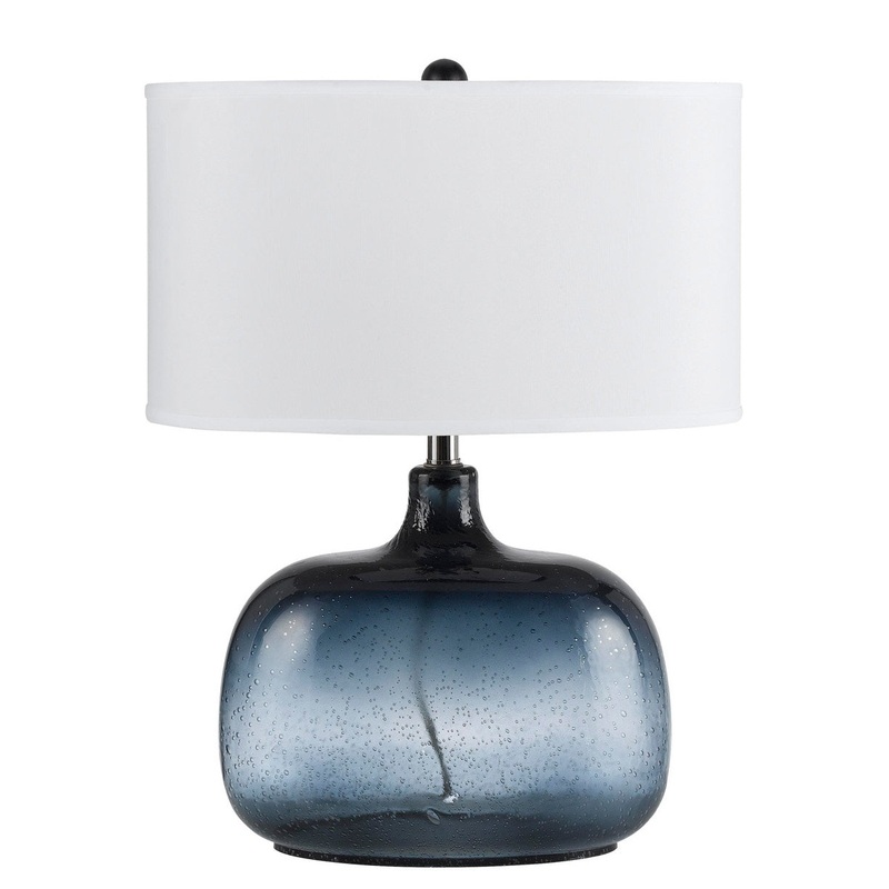 This elegant and timeless table lamp from CAL Lighting is great piece of decor above a nightstand or side table. It features a large bubble glass jar style body with navy blue blown glass. The lamp's look is completed with crisp linen shade and matching fi