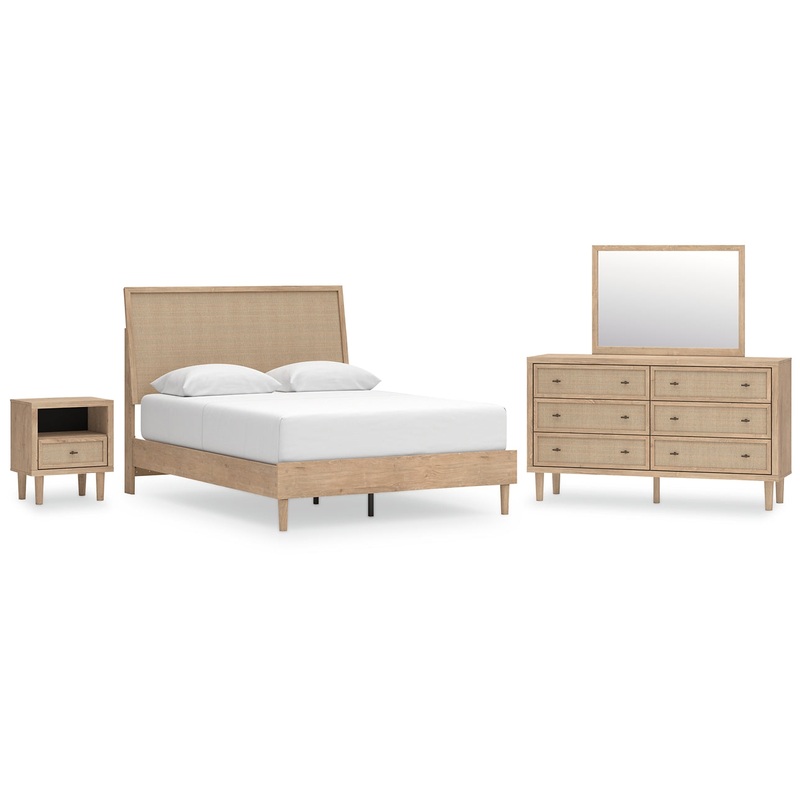 Clean-lined and contemporarybut far from starkthis bedroom package is a fresh style awakening. Pairing a light finish with replicated oak grain and textured beige details that replicate the look of cane, its mixed materials bring a naturally versatile vibe