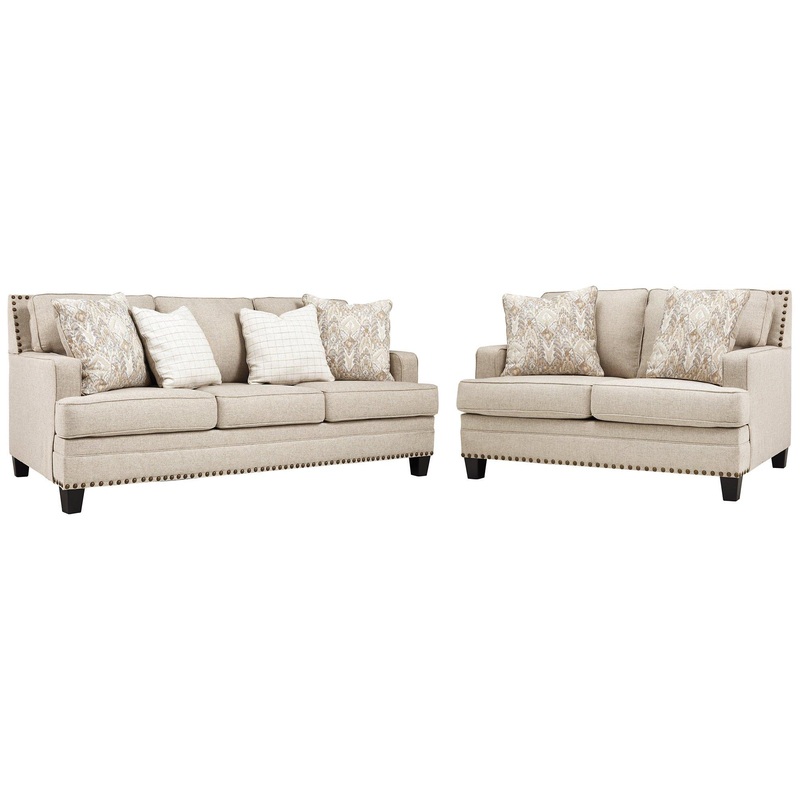 A case of contemporary and classic style influences coming together in a beautiful way, the Claredon living room set in beige brings a fresh perspective to modern farmhouse living. Distinctive elements include t-cushioning that wraps around setback track arms, nailhead trim and a lovely linen-weave upholstery for an up-to-date feel.