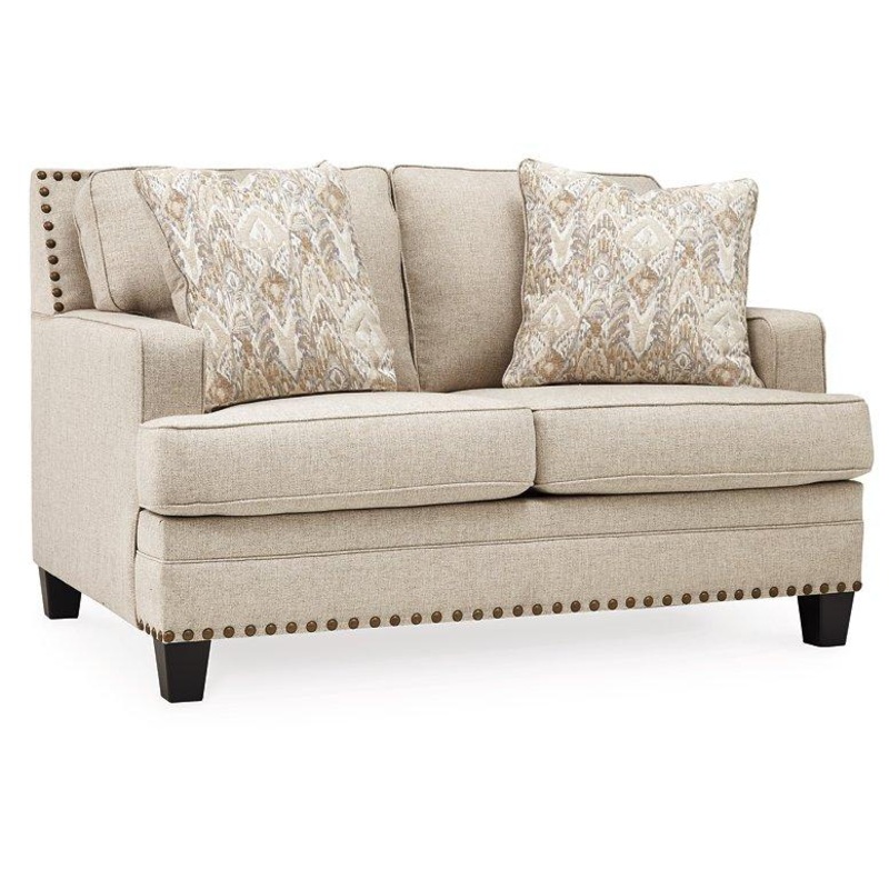 A case of contemporary and classic style influences coming together in a beautiful way, this loveseat in beige brings a fresh perspective to modern farmhouse living. Distinctive elements include t-cushions that wrap around setback track arms, nailhead trim and a lovely linen-weave upholstery for an up-to-date feel. Muted hue designer throw pillows master the art of subtlety.
