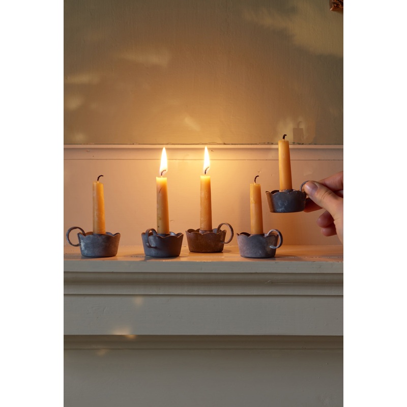 - A delightfully petite, short-stemmed candle holder with a sweetly scalloped edge- Crafted from steel with a rustic, antique finish - Features a diminutive round handle that makes it easy to transport- For little flickering flames atop a bedside, mantle o