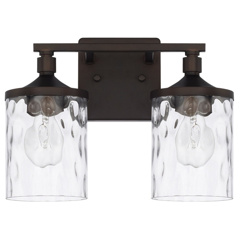 13" W x 10" H x 7" E 2-Light Clear Water Glass Vanity in Bronze -Bulb Type: Incandescent -Socket Type: E26 - Medium -# of bulbs: 2 -Max Wattage: 100 -Bulb(s) Included?: No -Finish: Bronze -Collection: Colton -Back Plate(inches): 5 -Glass: Clear Water Glass