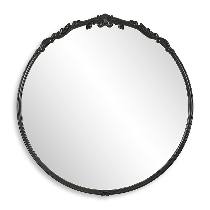 Accented with ornate details. this beautiful 30" round mirror is finished in a rich satin black. A light gray glaze accentuates the details. Perfect in an entryway over a vanity or over your favorite table. Model # (MPN)W00575Product ID200395564Manufacture