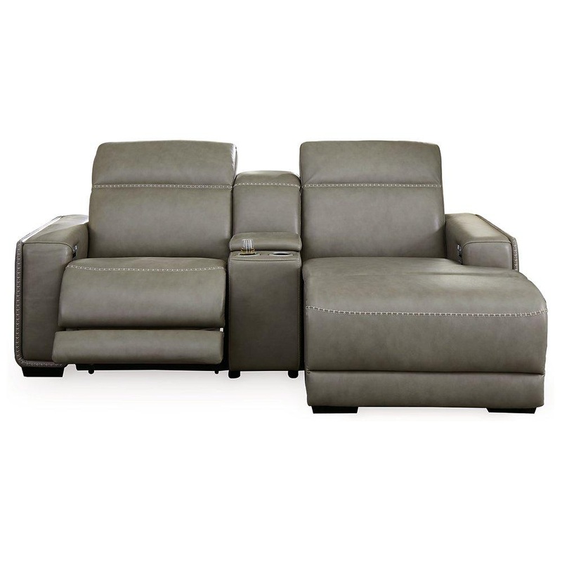 Truly putting high design into recline, this power reclining sectional with chaise with gray leather match upholstery proves that just because youre a recliner doesnt mean you have to look like one. Deceptively beautiful, its ultra clean-lined aesthetic is as cool and contemporary as they come. Low-profile back has a super swank look. When you need more support for your head and neck, the press of a button engages the Easy View power adjustable headrest, designed to let you lean back and still have a primo view of the TV. Ever-so-subtle curves and stunning stitching perfect the aesthetic.