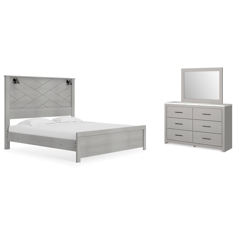 Cool, clean and casually modern. This bedroom packages wispy dove gray finish and replicated marble set the tone for your calming sanctuary. Large linear drawer pulls add dimension and authenticity, while the bed's abstract headboard design brings a fresh