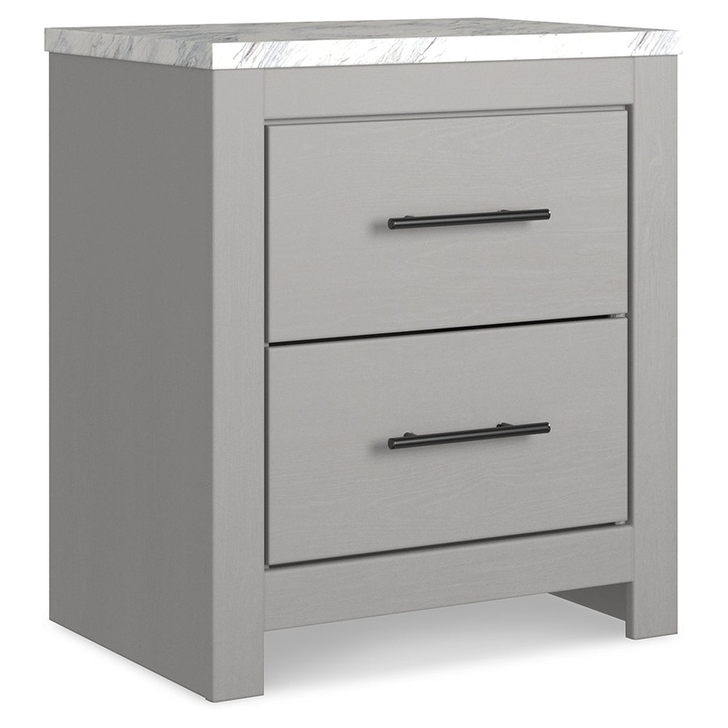 Cool, clean and casually modern. This nightstands wispy dove gray finish and faux Calcutta marble top set the tone for your calming sanctuary. Large linear pulls add dimension and authenticity. Two smooth-gliding drawers neatly accommodate your bedside needs.