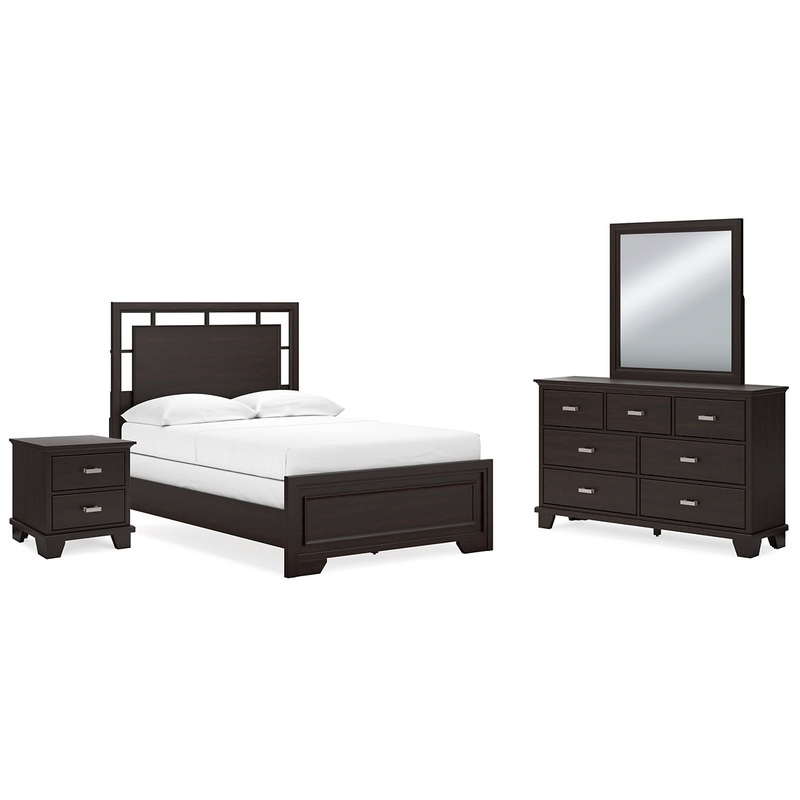 Details B441B4: Includes panel headboard, footboard, rails and slats, Made with hardwood solids, engineered wood veneer and MDF substrates, Dark brown finish, Floating panel headboard, Picture frame footboard, Foundation/box spring required, sold separately , Mattress available, sold separately, Assembly required, B441B1: Includes dresser and mirror, Made with hardwood solids, engineered wood veneer and MDF substrates, Dark brown finish, Metal bar pulls with bright nickel-tone finish, 7 smooth-gliding drawers with dovetail construction and metal center guides, Drawer interiors are lined with a wood grain laminate for a clean, finished look, Top moulding on dresser, Mirror attaches to back of dresser, B441-92: Made with hardwood solids, engineered wood veneer and MDF substrates, Dark brown finish, Metal bar pulls with bright nickel-tone finish, 2 smooth-gliding drawers with dovetail construction and metal center guides, Drawer interiors are lined with a wood grain laminate for a clean, finished look, Top moulding,