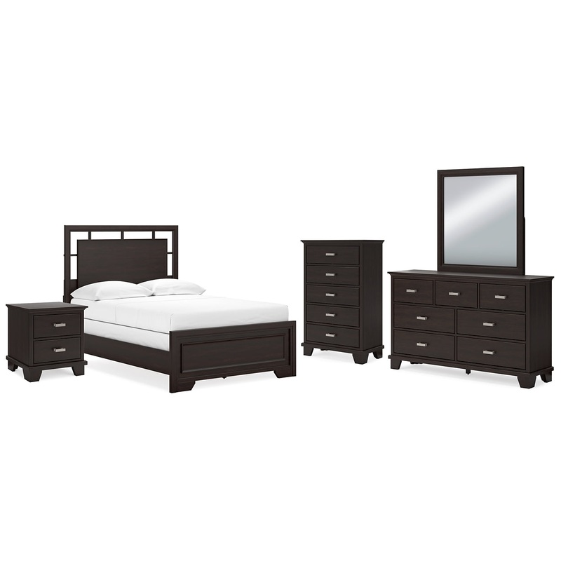 Details B441B4: Includes panel headboard, footboard, rails and slats, Made with hardwood solids, engineered wood veneer and MDF substrates, Dark brown finish, Floating panel headboard, Picture frame footboard, Foundation/box spring required, sold separately , Mattress available, sold separately, Assembly required, B441B1: Includes dresser and mirror, Made with hardwood solids, engineered wood veneer and MDF substrates, Dark brown finish, Metal bar pulls with bright nickel-tone finish, 7 smooth-gliding drawers with dovetail construction and metal center guides, Drawer interiors are lined with a wood grain laminate for a clean, finished look, Top moulding on dresser, Mirror attaches to back of dresser, B441-46: Made with hardwood solids, engineered wood veneer and MDF substrates, Dark brown finish, Metal bar pulls with bright nickel-tone finish, 5 smooth-gliding drawers with dovetail construction and metal center guides, Drawer interiors are lined with a wood grain laminate for a clean, finished look, Top moulding, B441-92: Made with hardwood solids, engineered wood veneer and MDF substrates, Dark brown finish, Metal bar pulls with bright nickel-tone finish, 2 smooth-gliding drawers with dovetail construction and metal center guides, Drawer interiors are lined with a wood grain laminate for a clean, finished look, Top moulding,