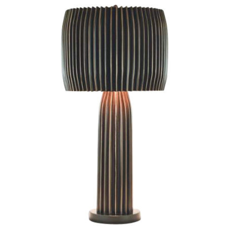 A striking hand-crimped steel base and matching shade give the Crimp Lamp its unique three-dimensional character. Available in both an antique nickel and warm bronze finish (as shown), the piece is grounded by a granite base that adds depth and complements