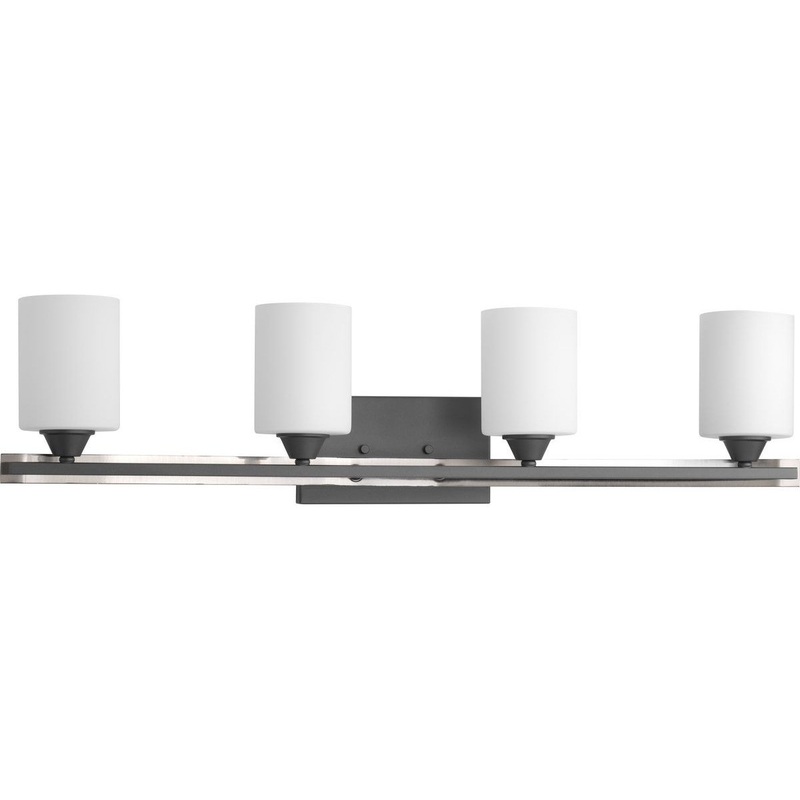 Dart is a display of modern architectural design styling. Etched white glass shades balance on a striking arched frame. Subtle detailing is enhanced by a Graphite finish with brushed nickel accents. Uses (4) 100-watt medium bulbs (not included).