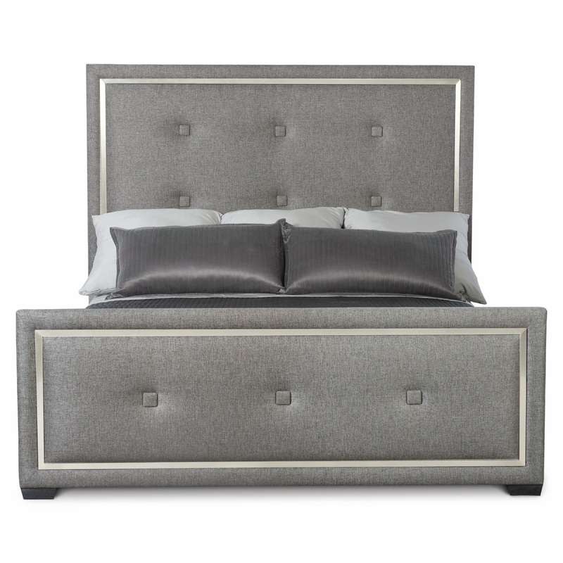 - Upholstered headboard and footboard with inset Stainless Steel frame overlay inside of upholstered border in Silver Mist finish.